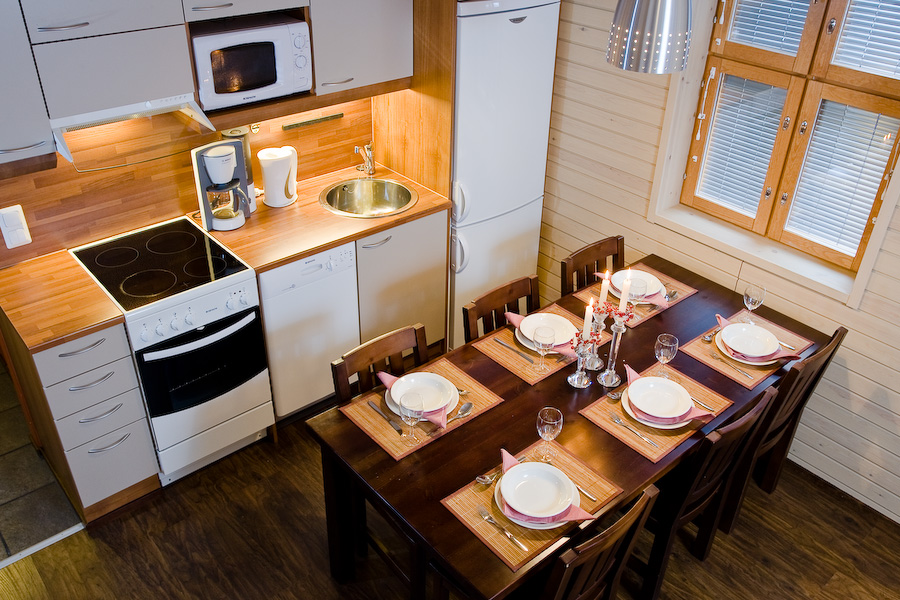 В апартаментах: камин (дрова для камина входят в стоимость), духовая печь, стиральная машина, туалет/душ, кухня, сауна. Всего 24 апартаментов, каждый на 2+2 спальных места.
