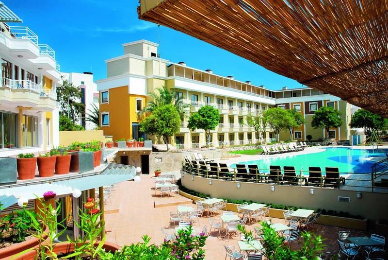 в 60 км от аэропорта г. Анталья, в г. Кемер, в 150 м через дорогу от моря.