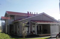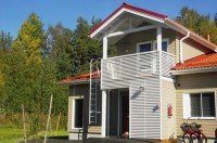 Коттеджи площадью 43,5 кв. м, на 2 + 2 человека, 1 спальня (2 спальных места), гостиная (софа, камин, телевизор, радио, видеомагнитофон, телефон, утюг, гладильная доска, фен), кухонный уголок (электроплита, микроволновая печь, холодильник, кофеварка, миксер, тостер, стиральная машина, посудомоечная машина), ярусный этаж (18 кв. м, 2 кровати), сауна, душ, туалет.
