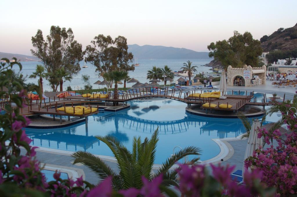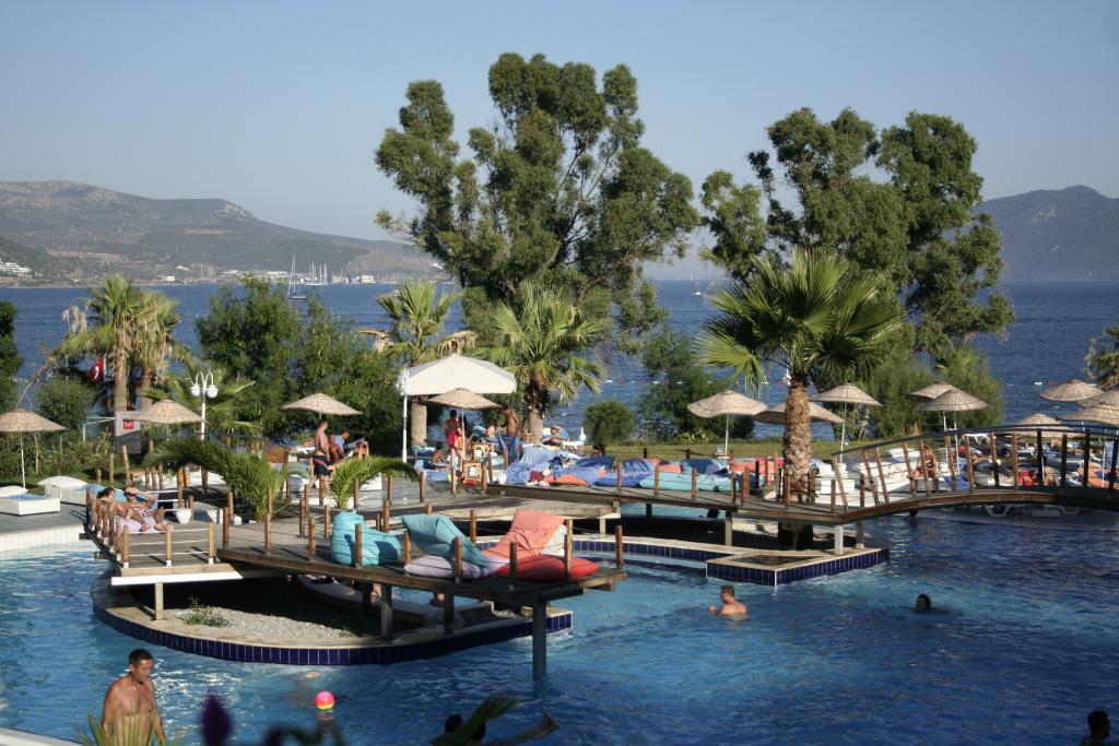 Отель расположен в живописной бухте и спускается террасами к морю. Территория очень красивая и необычная. До Бодрума можно добраться на маршрутке и по морю на морском такси за 10 минут.