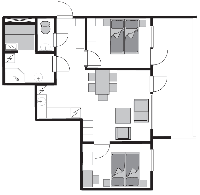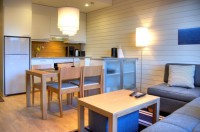 В апартаментах: обеденный стол на 4 человека, телевизор, DVD, интернет wifi, душ, туалет, электрическая сауна, шкаф для сушки одежды, утюг, плита, холодильник-морозильник, посудомоечная машина, микроволновая печь, тостер, кофеварка, просторный меблированный и застекленный балкон.