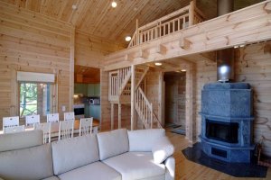 В двухэтажном коттедже 2005 года постройки: 2 спальни, гостиная (диван, камин, кабельное телевидение, подключение к интернету, телевизор, видео), кухня (посудомоечная и стиральная машины, холодильник, электроплита, кондиционер над плитой, микроволновая печь, кофеварка, электрический чайник), лофт (4 кровати), сауна, ванная комната, гардероб(комната для хранения одежды), 2 туалета, шкаф для сушки белья, фен, утюг, пылесос. Коттедж расположен на берегу экологически чистого озера Улиммяйнен. У коттеджа свой участок берега, свой причал и своя лодка. Расстояние до озера 20 м. Есть возможность арендовать велосипеды и снаряжение для рыбалки. Ближайшие соседи в 200 м.