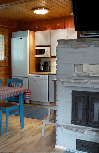 Во всех коттеджах – гостиная (диван, камин, телевизор, телефон), полностью оборудованная кухня (электроплита, микроволновая печь, посудомоечная машина), электрическое освещение и отопление, горячая и холодная вода, сушильный шкаф, сауна, душ, туалет. В коттеджах площадью 82 кв.м. и 99 кв.м. есть стиральная машина. Курить в коттеджах запрещено.