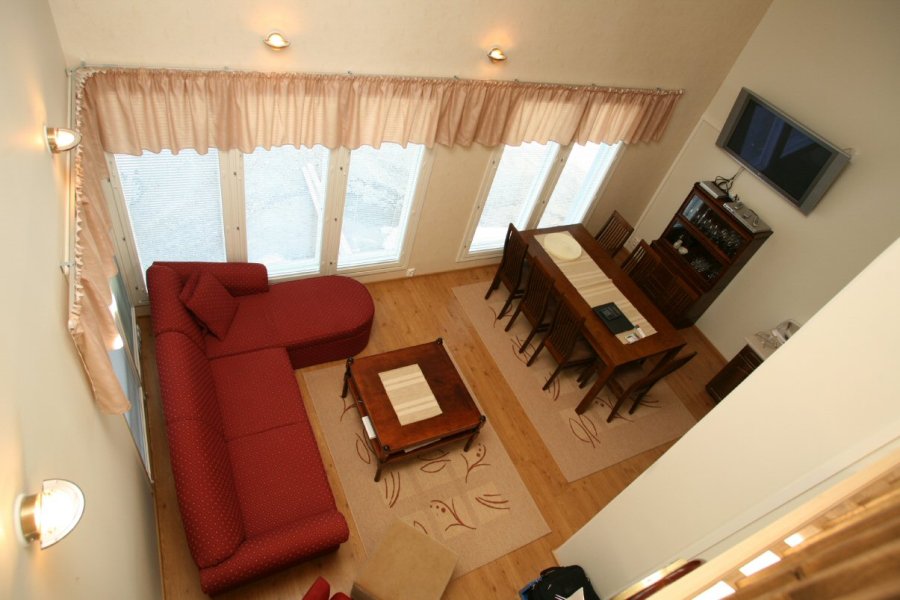 На первом этаже: одна спальня с 2 отдельными кроватями; каминная комната с угловым диваном, дрова, музыкальный центр; сауна с душем, туалет; помещение для стирки и сушки одежды.
