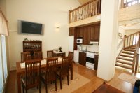 На втором этаже: одна спальня с двухместной кроватью; гостиная с большим угловым диваном, плоским ТВ, DVD-проигрывателем; оборудованная кухня второй туалет; большой балкон.